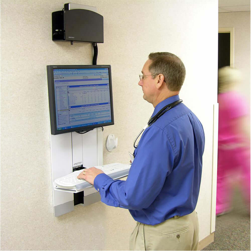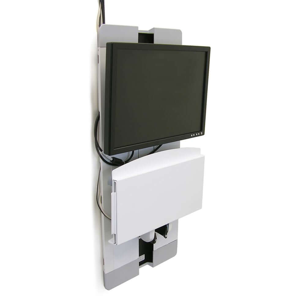 Perfect for space-constrained and high-traffic areas. The low profile vertical lift provides 9" (23 cm) of smooth vertical adjustment and folds into a slim, compact unit when not in use—less than 4" (10 cm) from the wall. A unique cable management system conceals and organizes cords and makes cleaning a snap!
